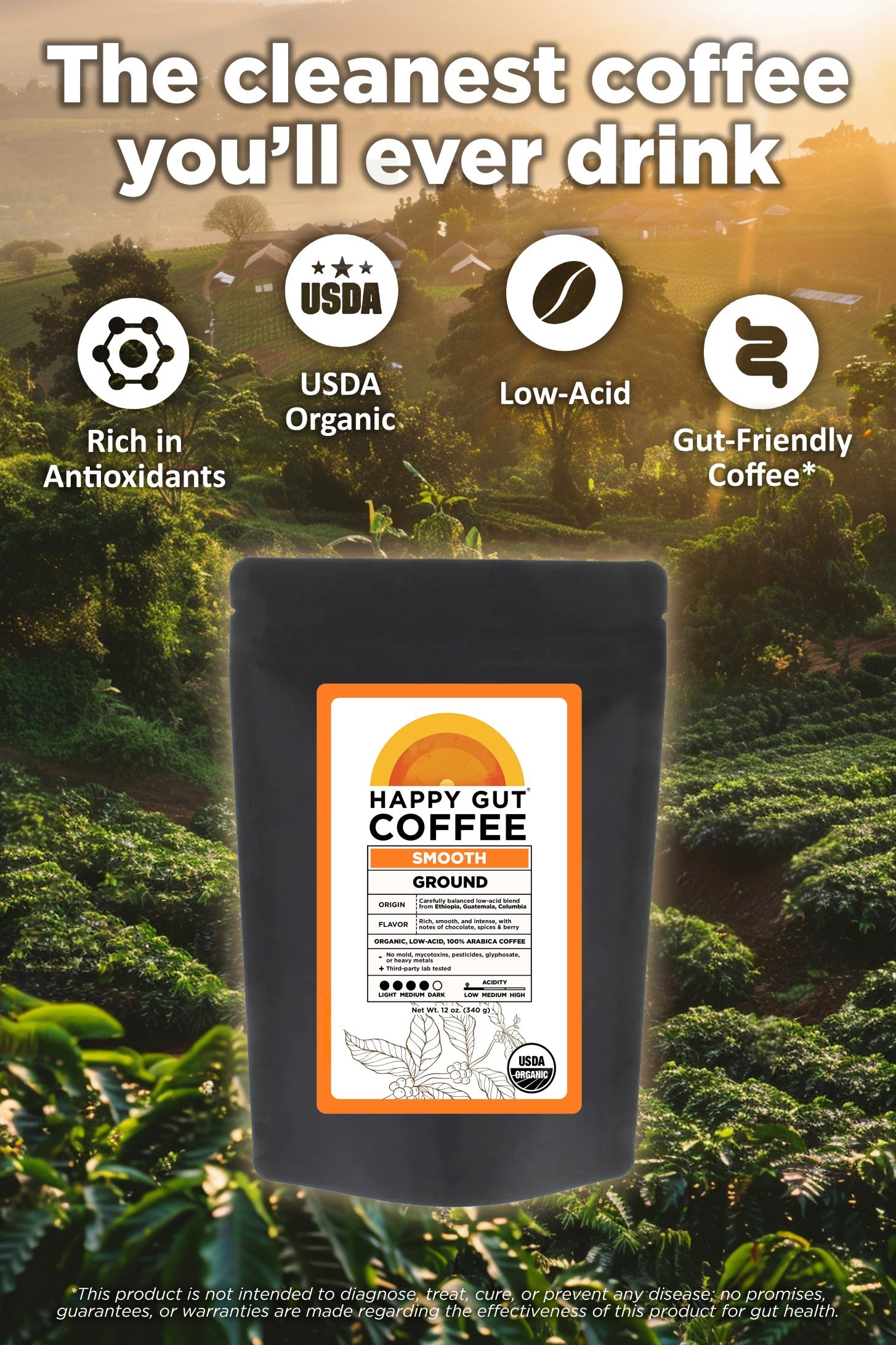 Happy Gut Coffee is crafted from organic, fair-trade beans grown in Ethiopia, Colombia, and Guatemala, and air-roasted using a state-of-the-art fluid-bed process that avoids smoke and harmful byproducts.