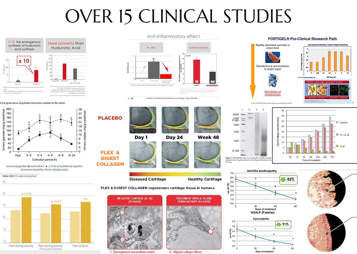 FLEX & DIGEST COLLAGEN delivers concentrated relief where you need it most. Unlike standard collagen products, our formula is scientifically validated by 15+ clinical studies showing how its bioactive peptides actively stimulate cartilage regeneration and repair connective tissue damage.